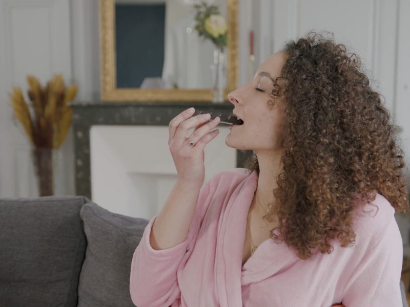 devojka jede red tamne čokolade