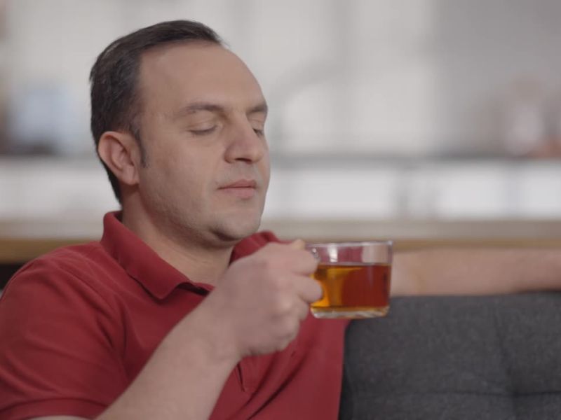 Čovek sedi u dnevnom boravku i pije biljni čaj od ruzmarina