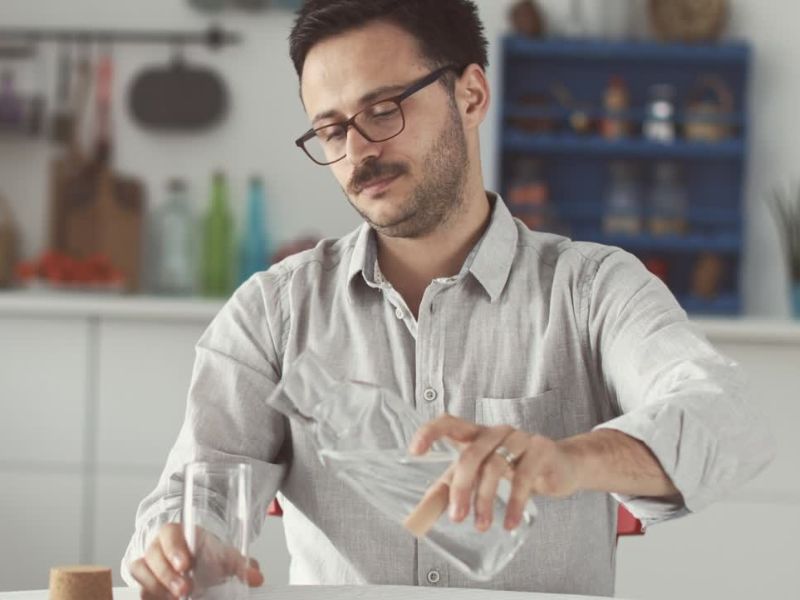 dečko u sivoj košulji sedi i sipa iz staklene flaše vodu u čašu