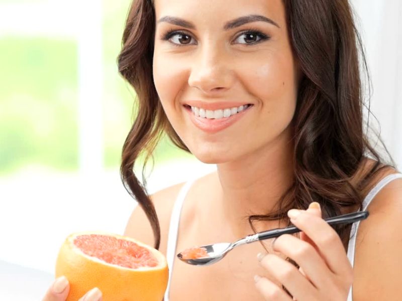 nasmejana devojka jede grejp sa kašikom